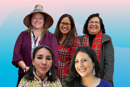 A group of people stand in front of a colorful mural in the CZI Community Space, smiling and raising their hands in a celebratory pose.